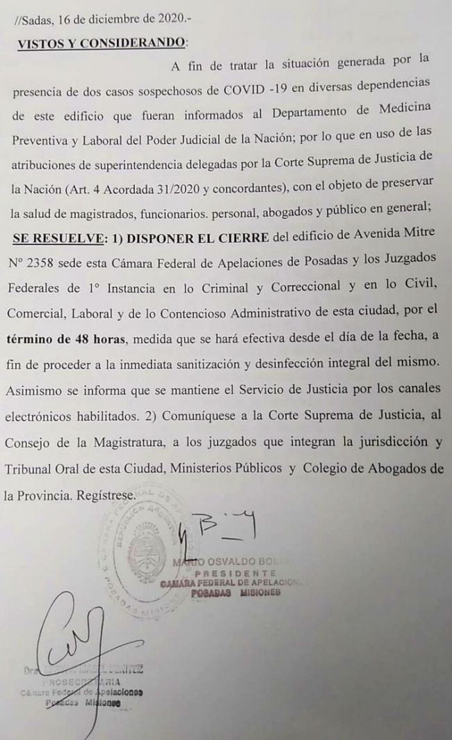 1) DISPONER EL CIERRE del edificio de Avenida Mitre N° 2358 sede esta Cámara Federal de Apelaciones de Posadas y los Juzgados Federales de 1° Instancia en lo Criminal y Correccional y en lo Civil, Comercial, Laboral y de lo Contencioso Administrativo de esta ciudad, por el término de 48 horas, medida que se hará efectiva desde el día de la fecha, a fin de proceder a la inmediata sanitización y desinfección integral del mismo. Asimismo se informa que se mantiene el Servicio de Justicia por los canales electrónicos habilitados.